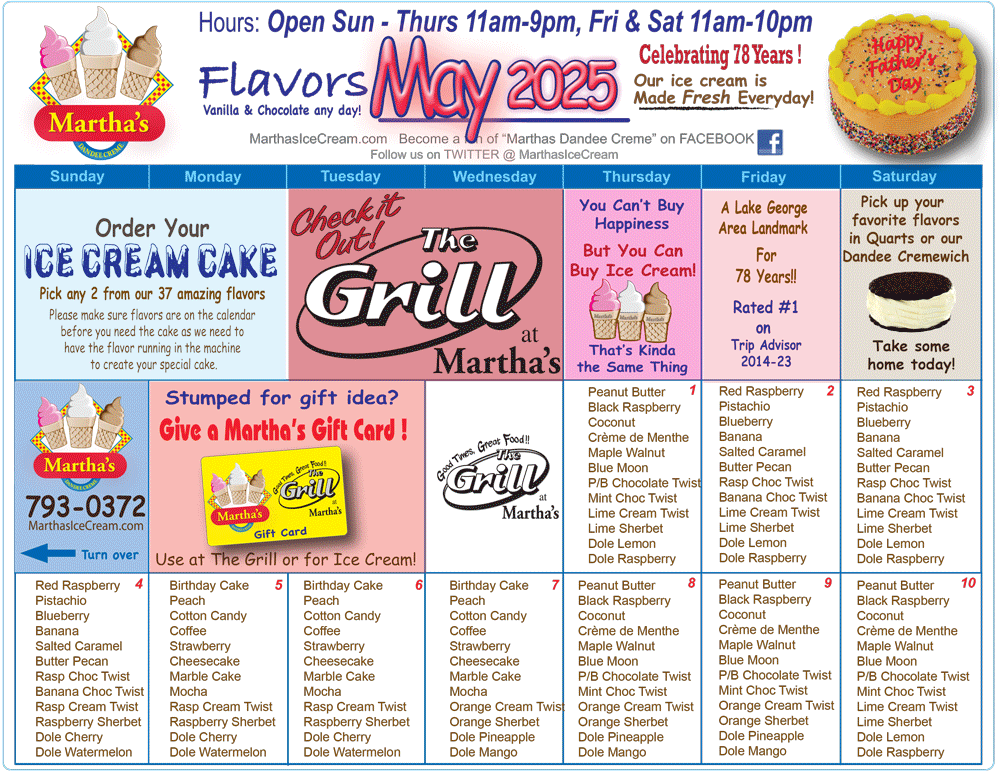 A landmark for more than 78 years on Route 9 between Lake George and Glens Falls, Martha’s is back in the hands of the second owners, the Lafontaine family. The site is a former chicken farm owned by the Harkness family. Its fame as a restaurant and later an ice cream stand started in the late 1930’s tradition.